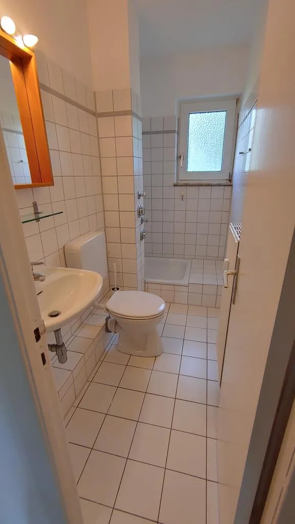 Die angebotene Wohnung liegt im Erdgeschoss links eines Mehrfamilienhauses.