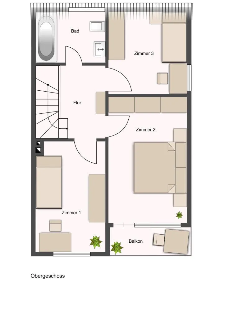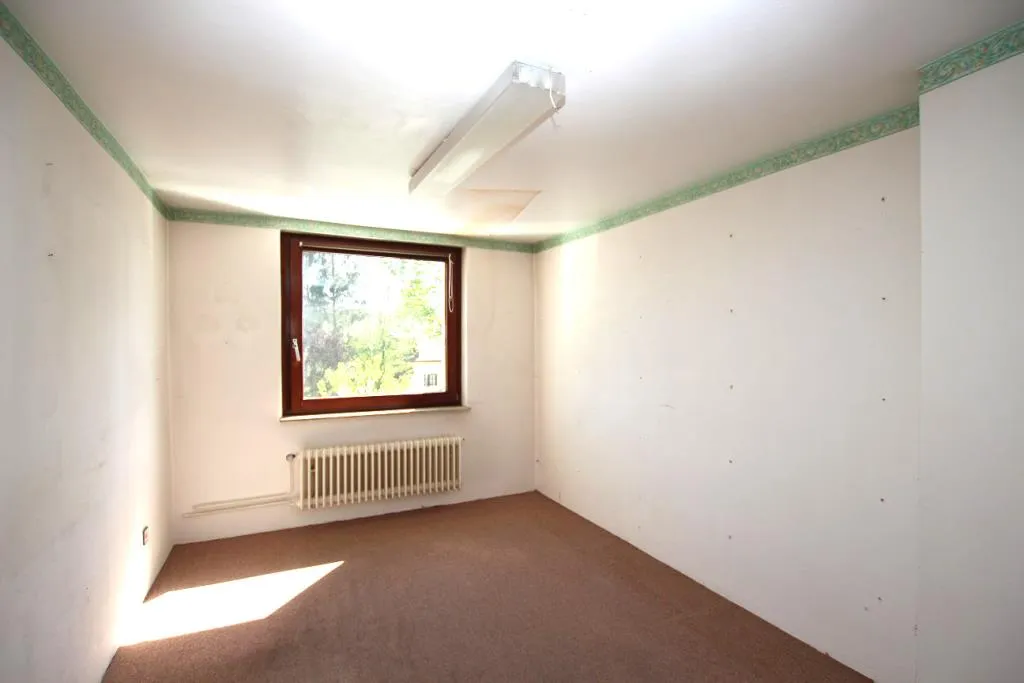 Im Obergeschoss befinden sich das Schlafzimmer mit Zugang zum Süd-Balkon, drei weitere Zimmer sowie ein Vollbad mit Fenster.