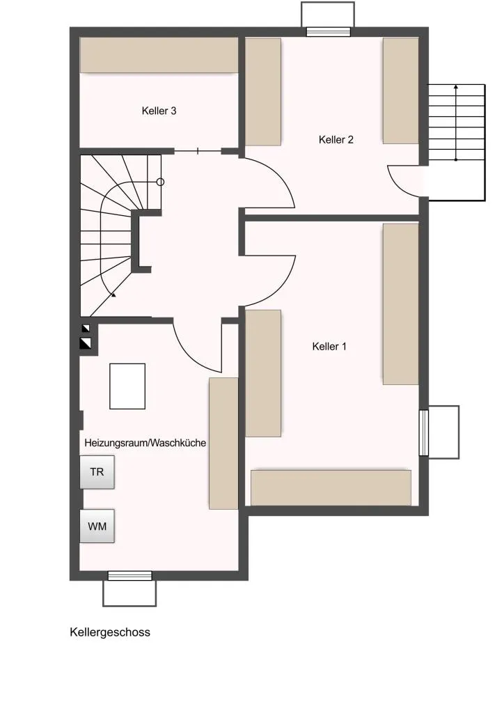 Das Kellergeschoss bietet Platz für einen Vorratsraum, eine Waschküche, einen Hobbyraum sowie ein zusätzlicher Raum, welcher von den Voreigentümern als Gästezimmer genutzt wurde. Eine Kellertreppenabseite bringt zusätzlichen Stauraum. Der Keller verfügt über eine Außentreppe zum Garten.