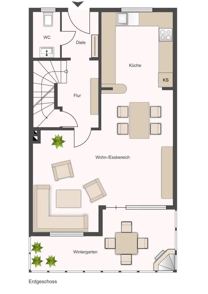 Über einen ansprechenden Vorgarten gelangt man zum Eingangsbereich der Doppelhaushälfte. Im Erdgeschoss befindet sich die geräumige Wohnküche in Kombination mit dem Wohn- sowie Essbereich mit Zugang zum beheizten Wintergarten.