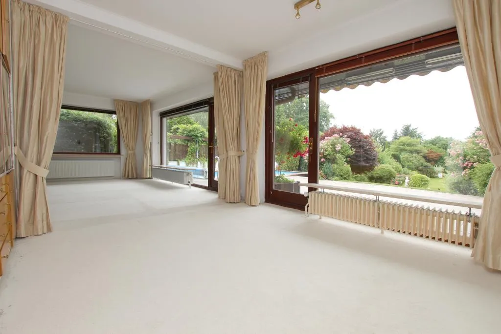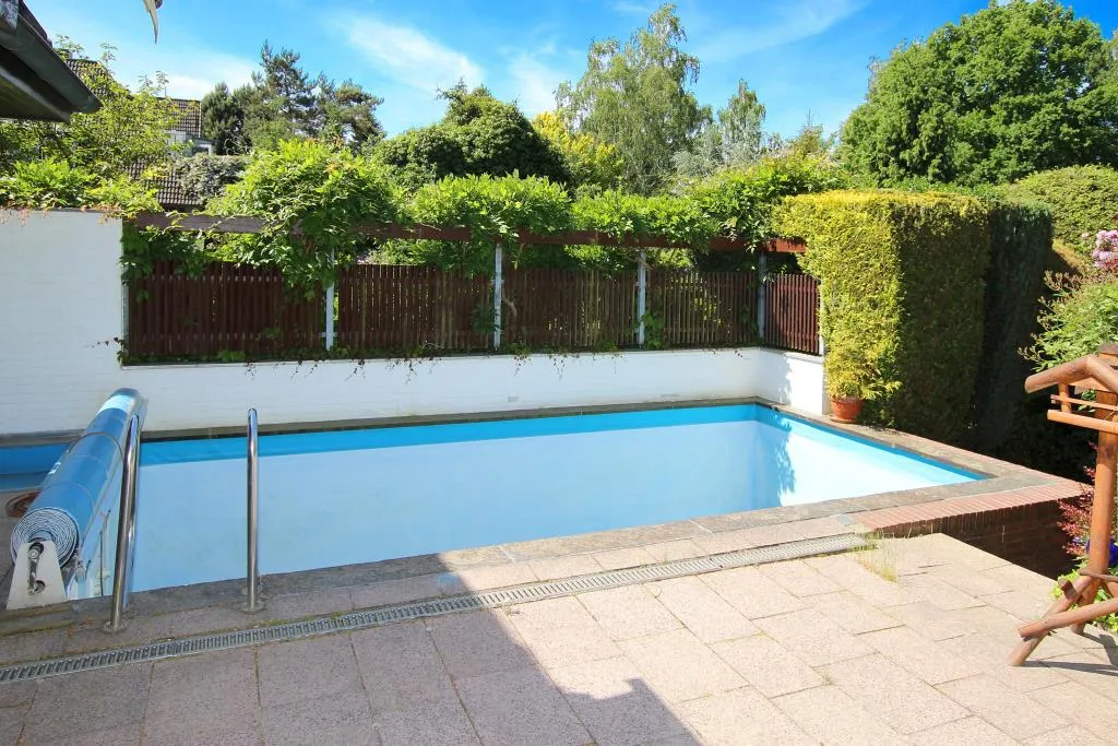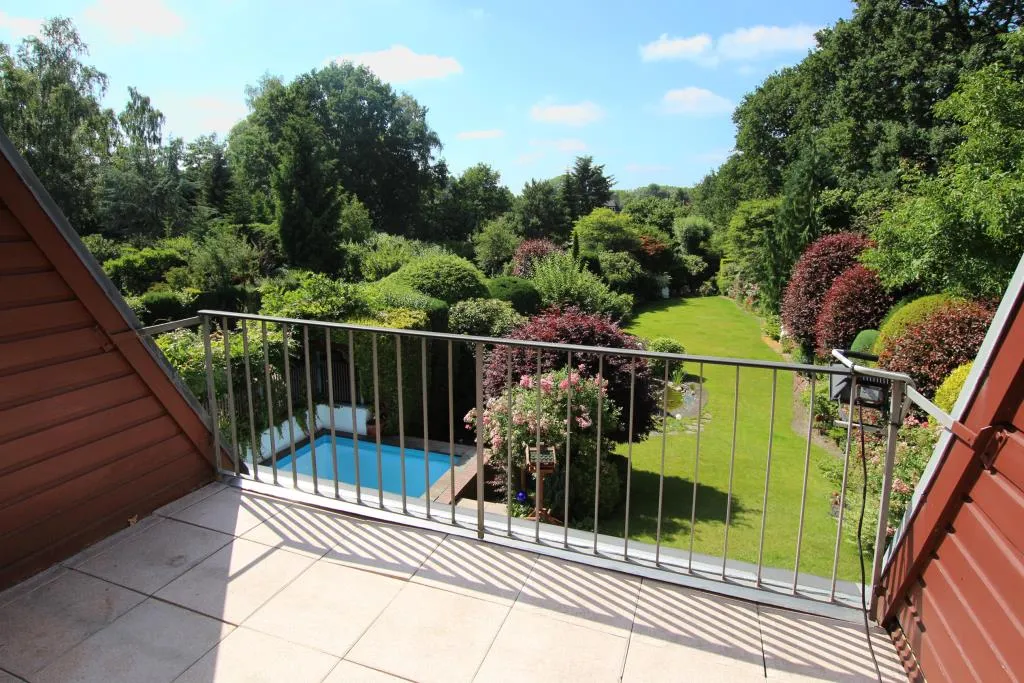 Die große Fensterfront verfügt über einen direkten Zugang auf die nach Süd-West ausgerichtete ca. 45 m² große Terrasse mit einem eingelassenen 22 m³ großen Pool, einer Gartendusche und Blick in den gepflegten, parkartig angelegten Garten mit Teichanlage.