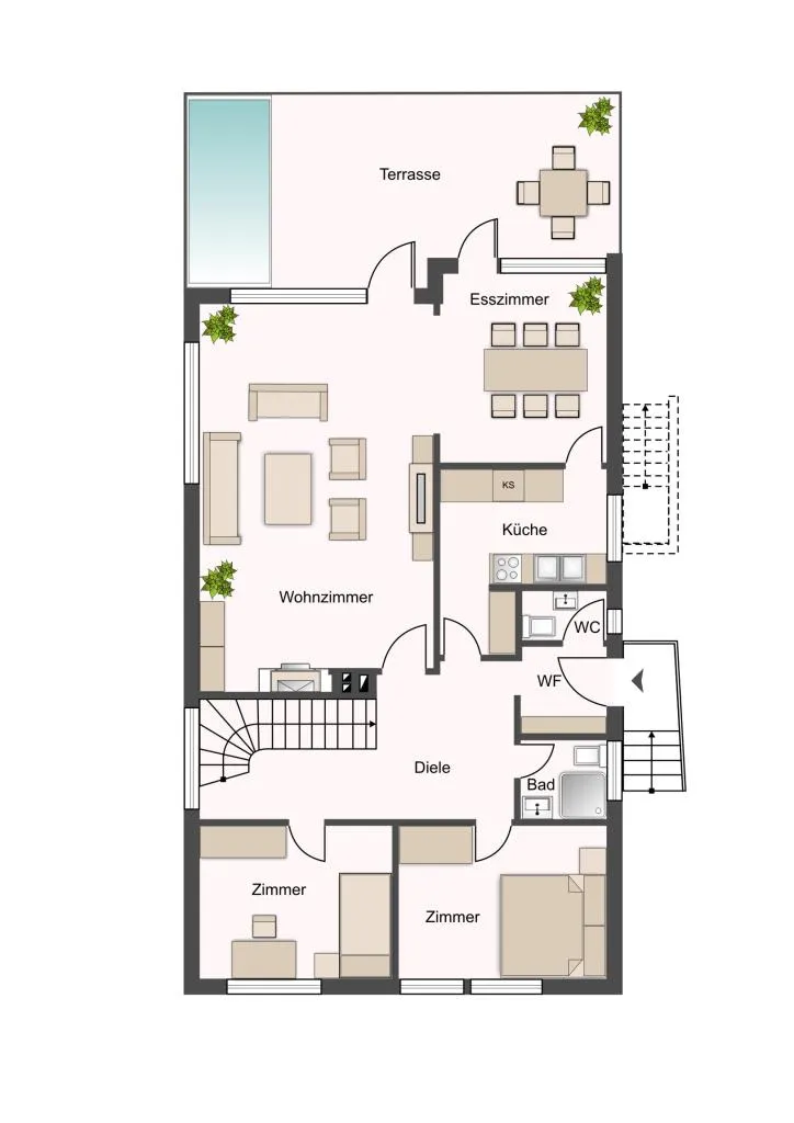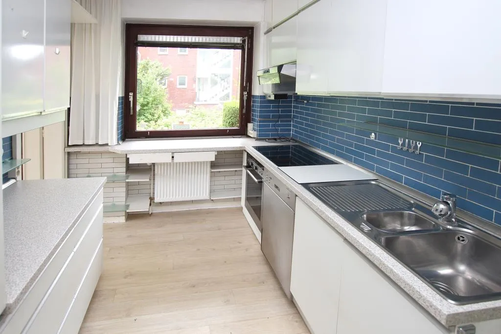 Angrenzend zum Essbereich befindet sich die Küche, die mit einer Einbauküche ausgestattet ist. Zu dem befinden sich im Erdgeschoss zwei weitere gut geschnittene Zimmer, ein Duschbad sowie ein Gäste-WC.