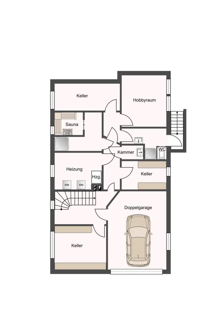 Das Objekt ist vollständig unterkellert und verfügt im vorderen Bereich über eine Doppelgarage, eine Sauna mit Dusche, ein separates Duschbad mit Außenzugang, einen Heizungsraum mit Waschmaschinenanschluss, zwei Kellerräume sowie einen Hobbyraum.