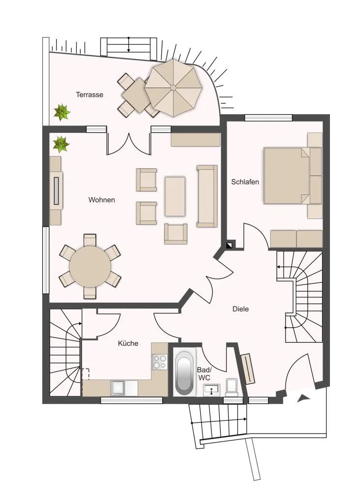 Über den linken Hauseingang betritt man das ca. 76 m² große Erdgeschoss, welches über einen großen Eingangsbereich, ein gut geschnittenes Schlafzimmer, eine Küche mit Einbauküche, ein Vollbad/WC mit Fenster und ein großzügiges Wohn- und Esszimmer mit bodentiefen Fenstern und Zugang auf die Terrasse und in den großen schönen Garten bietet.