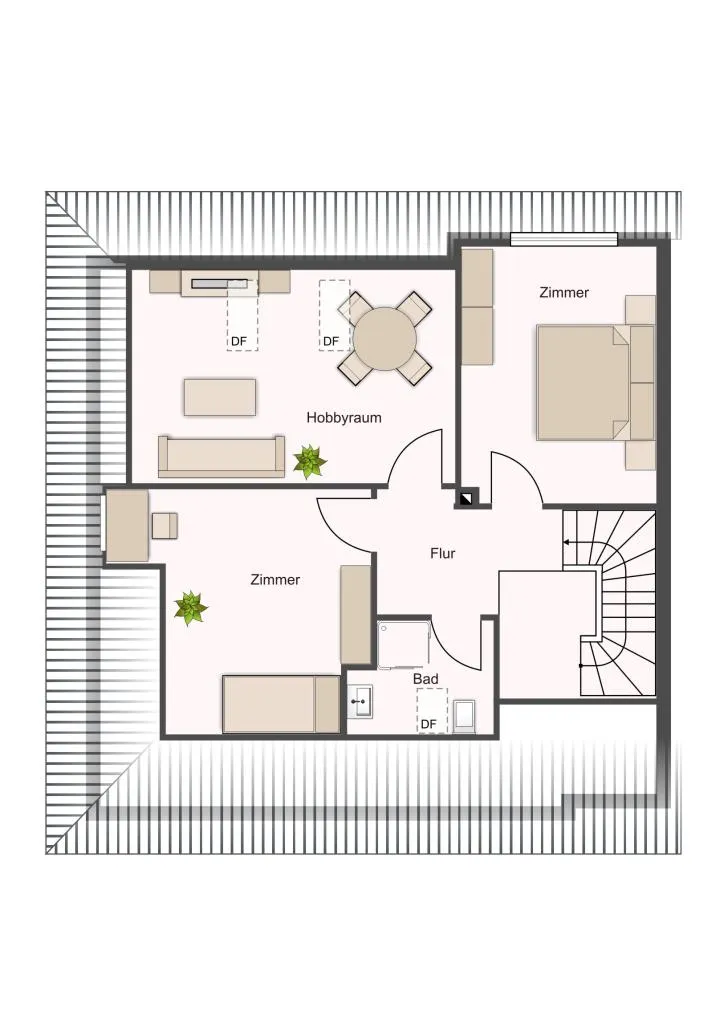 Eine Steintreppe im Dielenbereich führt in das ca. 35 m² große Dachgeschoss, welches über zwei Schlafzimmer und ein weiteres Badezimmer verfügt. Neben den zwei Schlafzimmern befindet sich im Dachgeschoss ein ca. 11 m² großer Hobbyraum.