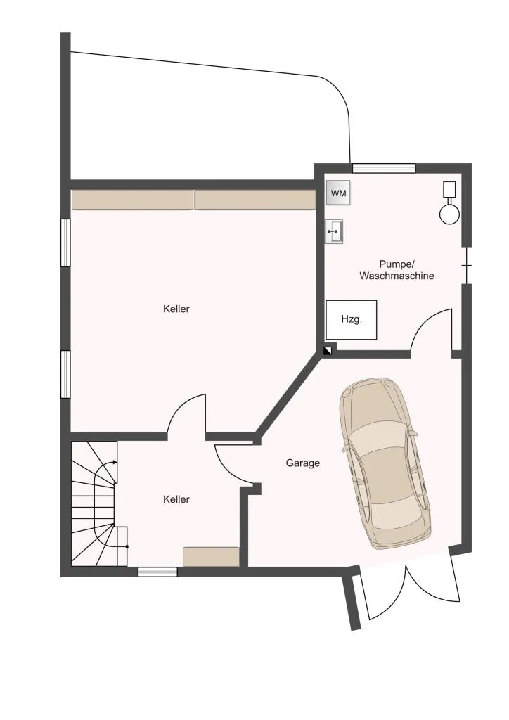 Über eine von dem Küchenbereich abgehende Treppe gelangt man in den großzügigen Vollkeller. Hier befinden sich ein ca. 33 m² großer Abstellraum, eine ca. 24 m² große Garage sowie ein Heizungsraum der mit einer Grundwasserpumpe ausgestattet ist.