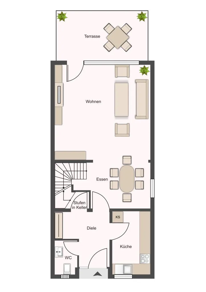 Das Erdgeschoss verfügt über einen geräumigen Eingangsbereich mit Garderobe, ein Gäste-WC, eine Küche mit Einbauküche sowie über einen großzügigen Wohn- und Essbereich mit Zugang zur nach Süden ausgerichteten Terrasse und in den Garten.