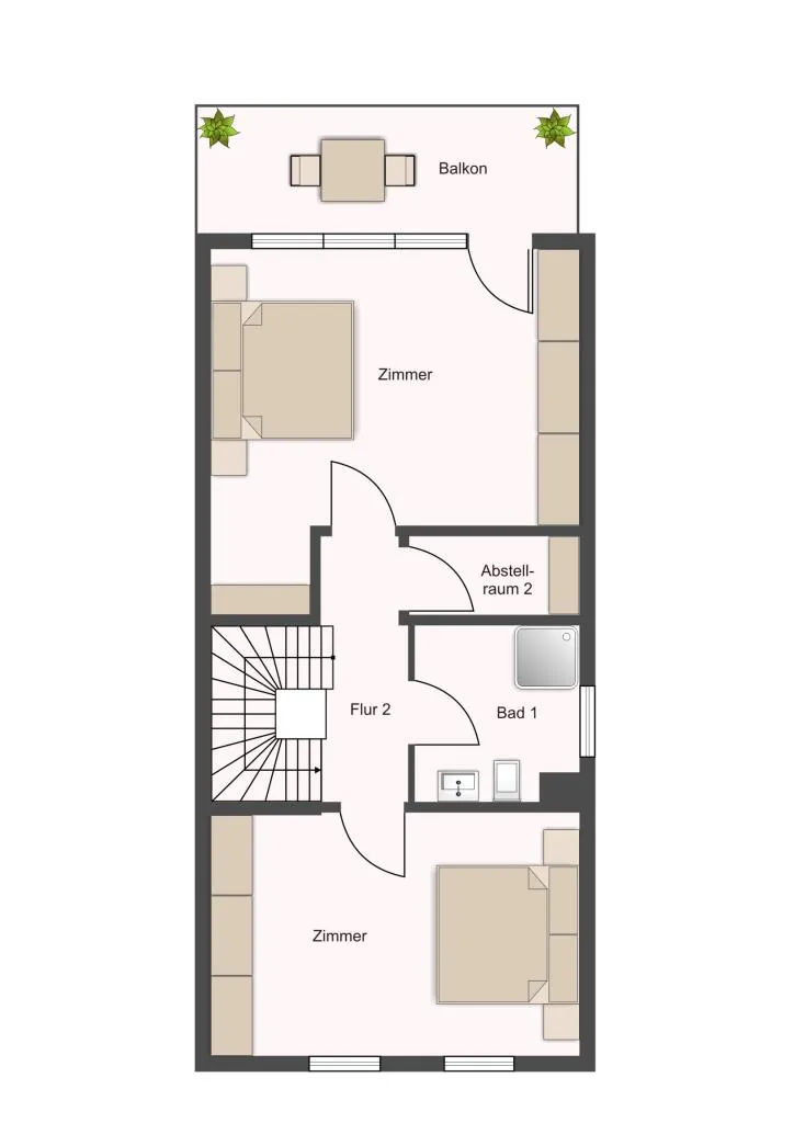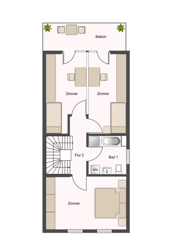 Über eine Treppe im Esszimmerbereich gelangt man in das Obergeschoss. Hier befindet sich ein Duschbad-WC mit Fenster sowie zwei gut geschnittene Zimmer, wovon ein Zimmer über einen großen Süd-Balkon verfügt und nach Bedarf in zwei Zimmer aufgeteilt werden.