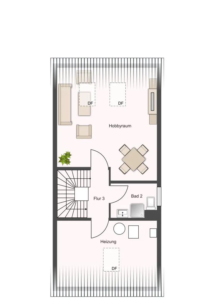 Im ausgebauten Dachgeschoss ist ein großer Hobbyraum, ein Heizungsraum sowie ein modernes, hellgefliestes Duschbad/WC mit Fenster vorhanden.