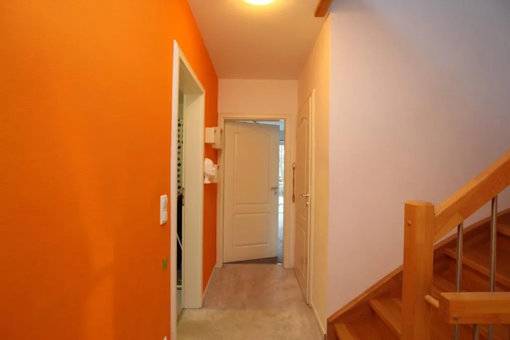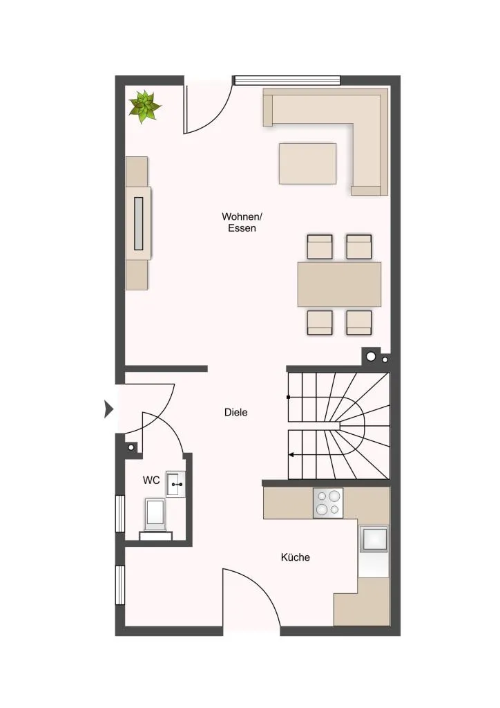 Süd-Terrasse sowie ein Gäste-WC mit Fenster. Das Wohnzimmer verfügt über einen Kaminofen mit 5 kW nach EU-Norm EN 13240. Da im Erdgeschoss keine Zimmertüren verbaut wurden, erfolgt der Übergang von der Diele zum Wohnzimmer sowie zur Küche fließend, wodurch die Räume sehr hell und großzügig wirken. Lediglich das Gäste-WC ist räumlich getrennt. Über die Küche gelangt man zur hinteren Terrasse und dem Garten.