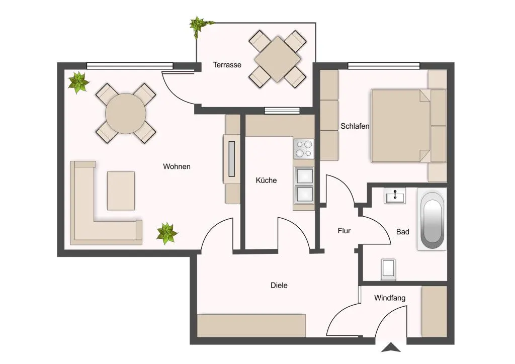 Gut geschnittene 2-Zimmer-Eigentumswohnung im Erdgeschoss mit hellen Wohnräumen und einer nach Süden ausgerichteten Terrasse.