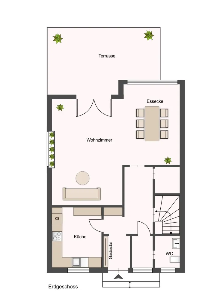 Im Erdgeschoss befindet sich das sehr gut belichtete Wohnzimmer mit Parkettfußboden und Zugang zur großzügigen West-Terrasse von ca. 18 m² und großzügiger Gartenfläche, das Esszimmer, Gäste-WC, die Küche, sowie eine Garderobe.